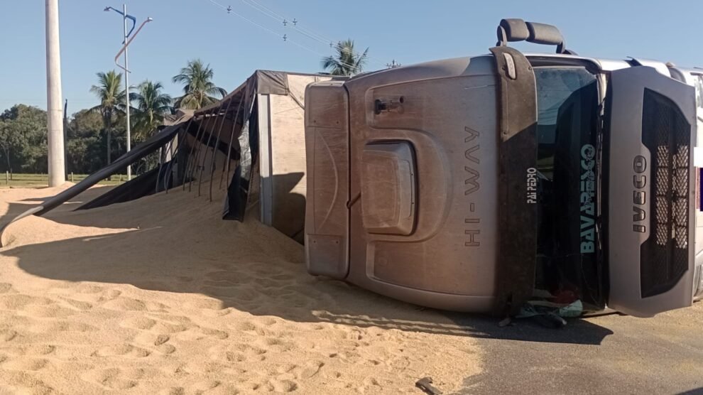 Carreta tomba em rodovia estadual e motorista é preso por embriaguez em Lucas do Rio Verde