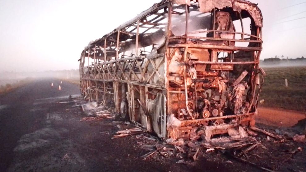 Ônibus que saiu de Sinop com destino à Juína, pega fogo e fica destruído em rodovia
