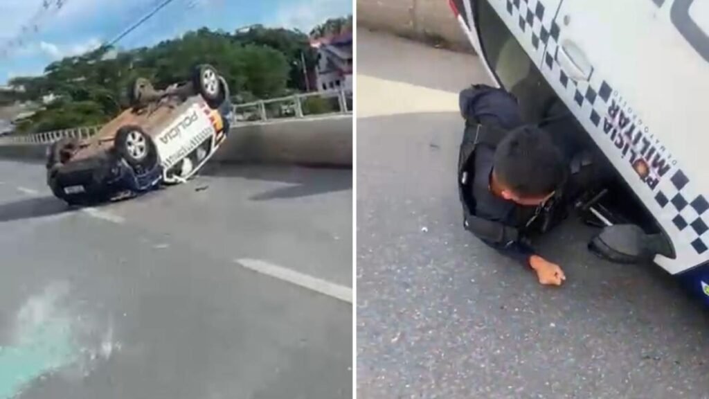 Viatura da Polícia Militar capota na Ponte Nova e causa susto a motoristas