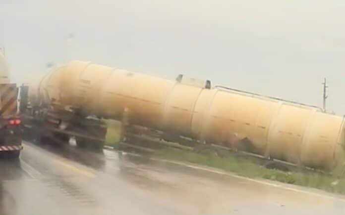 Caminhão-tanque sai da pista e interdita parcialmente BR-163 em Lucas do Rio Verde