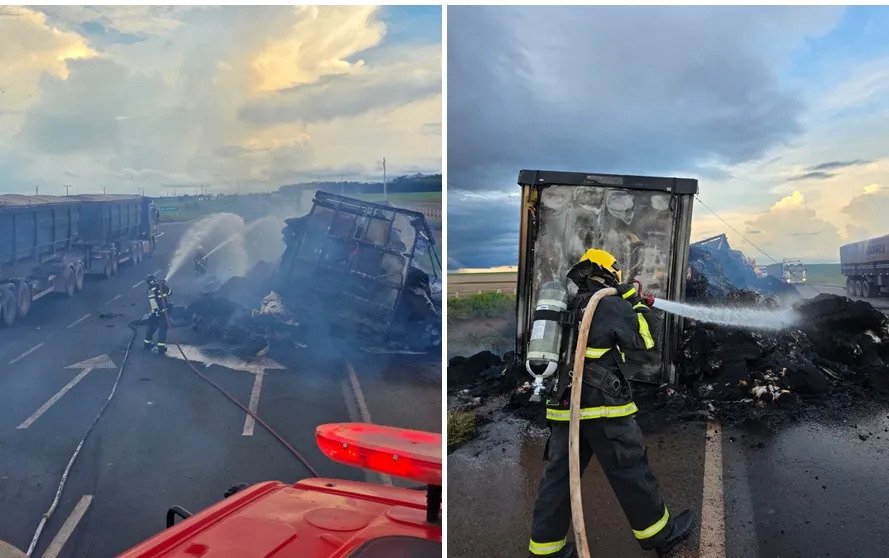 Carreta carregada com pluma pega fogo na BR-163 em Nova Mutum