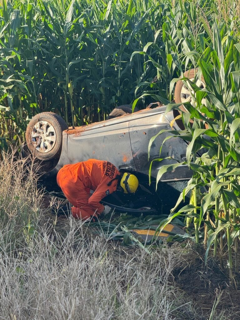 Carro capota na rodovia da Baiana e entra no meio de lavoura de milho em Lucas do Rio Verde