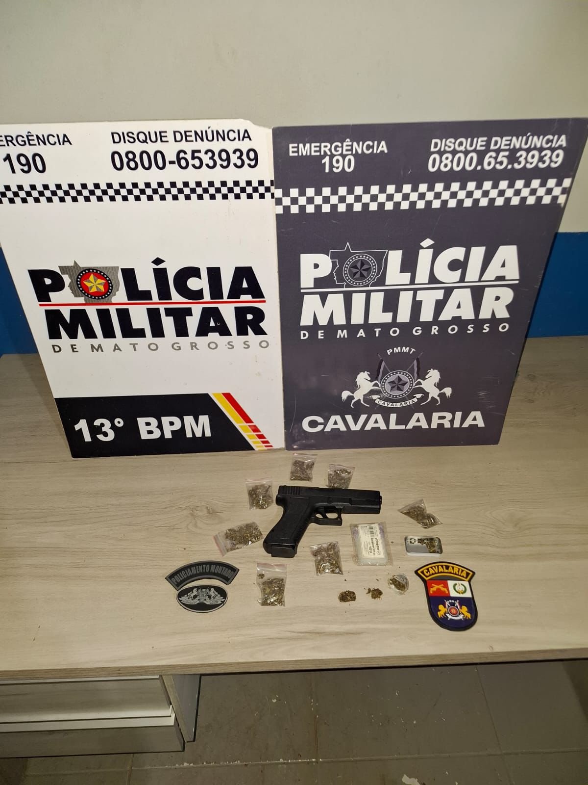 Ao todo, foram apreendidos oito porções de substância análoga à maconha, um simulacro de arma de fogo e um aparelho celular.