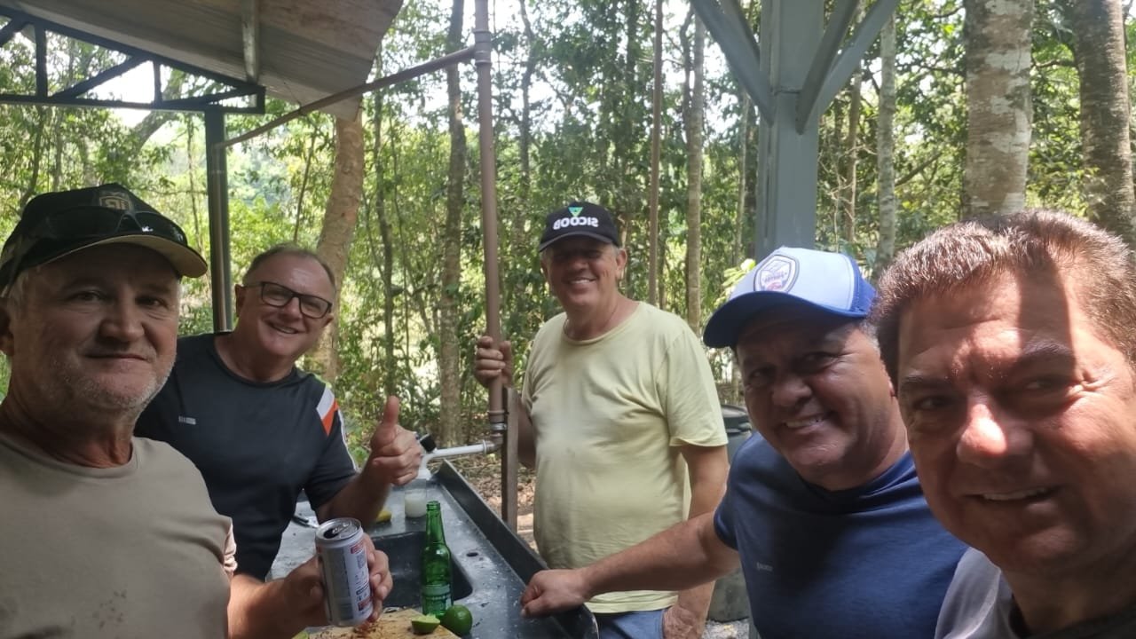 Além da cerveja gelada, os amigos degustaram um apetitoso churrasco acompanhado com madioca.