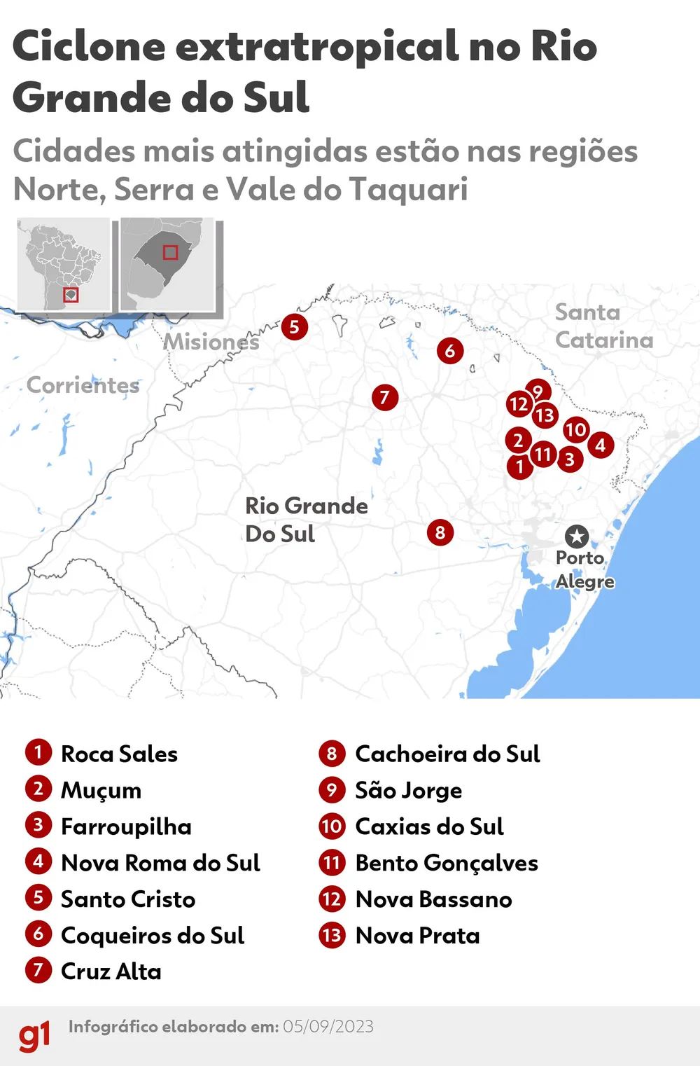 O fenômeno se formou na noite do dia 4 de setembro. Os estragos da virada no tempo começaram a ser vistos ainda durante o dia, em mais de 50 cidades que registram fortes rajadas de ventos, aumento do nível dos rios e pessoas desabrigadas. No primeiro dia da tragédia, foi confirmado que seis pessoas morreram.