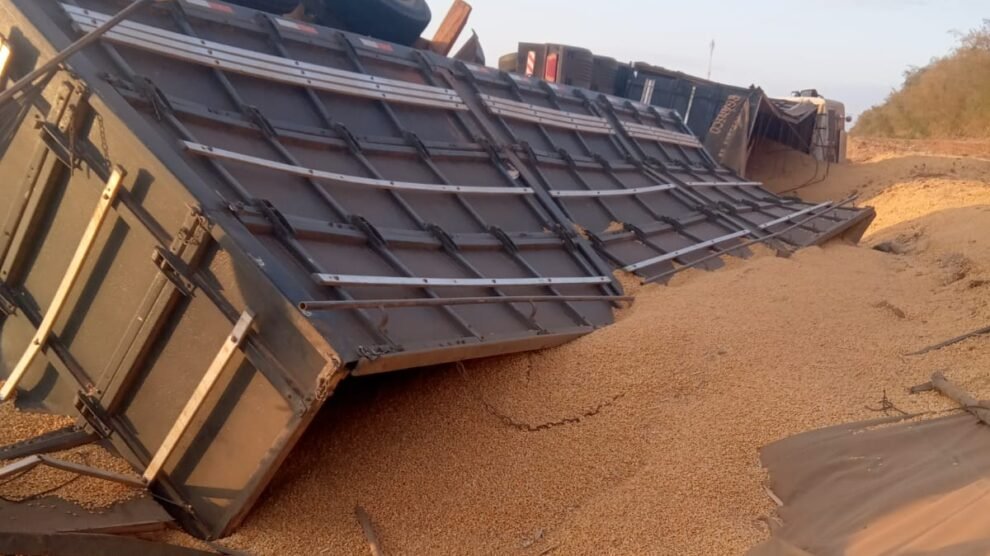 O acidente ocorreu no final desta quinta feira (17), no quilômetro 798 da BR-163, no trevo de acesso ao município de Vera, entre Sinop e Sorriso. O tombamento envolveu uma carreta Mercedes-Benz Actros branca, placas Brasil, carregada com milho.