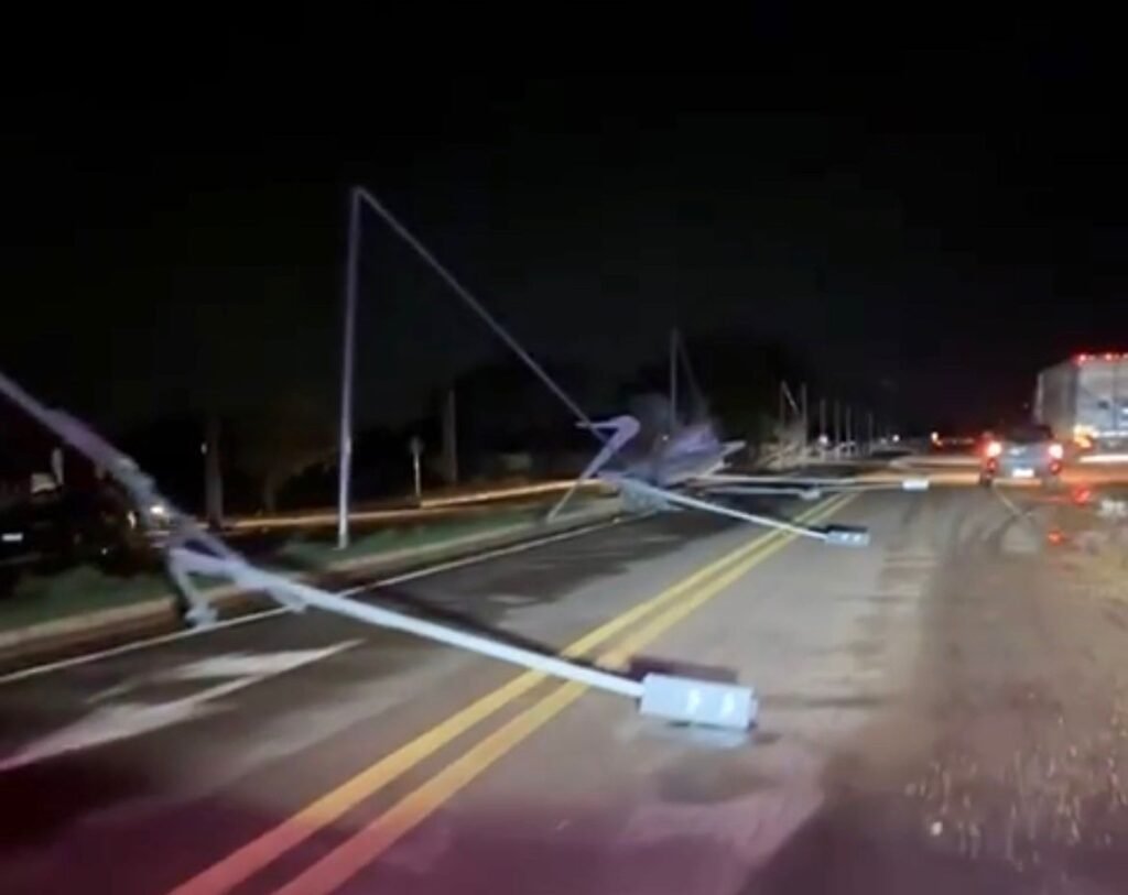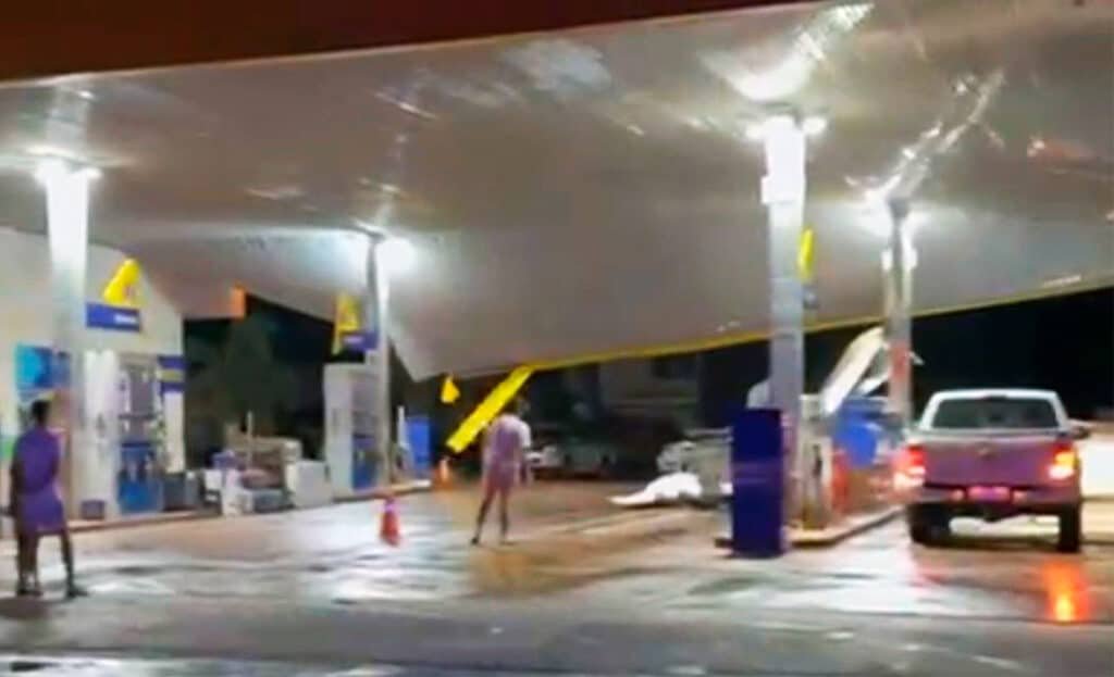 Imagens gravadas por moradores registraram a destruição na cidade, como um posto de combustíveis, que parte do teto cedeu, além de diversos postes caídos em ruas e avenidas da cidade.