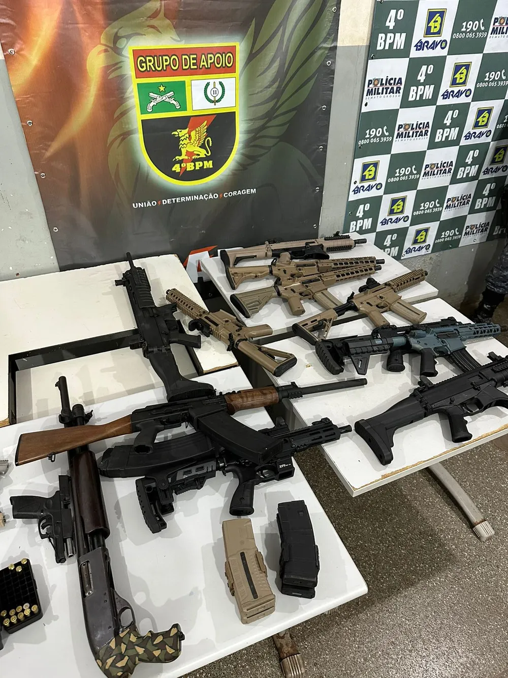Uma equipe foi até o local indicado e, momentos depois, um carro com os suspeitos chegou. Ao visualizarem os policiais, eles fugiram do local. Durante a perseguição, os suspeitos foram alcançados e, com eles, foram encontrados armas de fogo. Segundo a PM, durante uma ronda no bairro, o resto do armameto foi localizado.