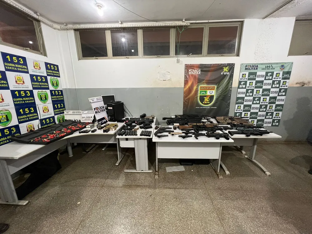 Três homens suspeitos de tráfico internacional de armas de fogo foram presos, na noite dessa terça-feira (15), em Várzea Grande, região metropolitana de Cuiabá. Com o grupo foi encontrado um arsenal de mais de 30 armas, entre fuzis, pistolas, espingardas e submetralhadoras, além de aproximadamente 450 munições.