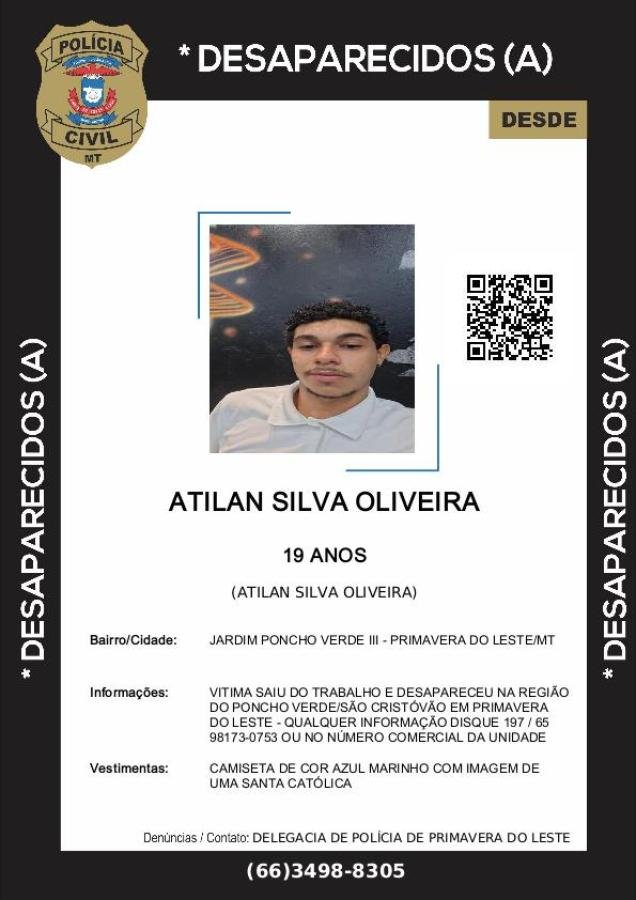 Família e amigos procuram por Atilan Silva Oliveira, 19, visto pela última vez no sábado (10), no Jardim Poncho Verde 3, em Primavera do Leste. A moto do rapaz foi encontrada abandonada em um local ermo próximo de sua casa. Polícia investiga o caso.