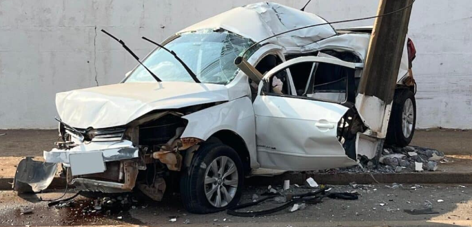 Dois jovens ficaram gravemente feridos após o carro em que estavam bater em um poste da rede elétrica, na Avenida Idemar Riede, em Sorriso, neste domingo (14). Com o impacto, o carro ficou completamente destruído e a estrutura de concreto foi danificada.