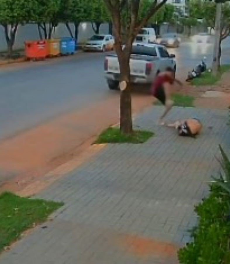 No domingo (28), as imagens de câmeras de segurança mostram o momento em que o empresário aparece descendo de uma caminhonete e agride a ex-companheira, que desce de uma motocicleta e sai correndo na tentativa de escapar das agressões do suspeito. Ele atira uma pedra em seguida ela tenta correr e cai no chão e ele chega e pratica a agressão.