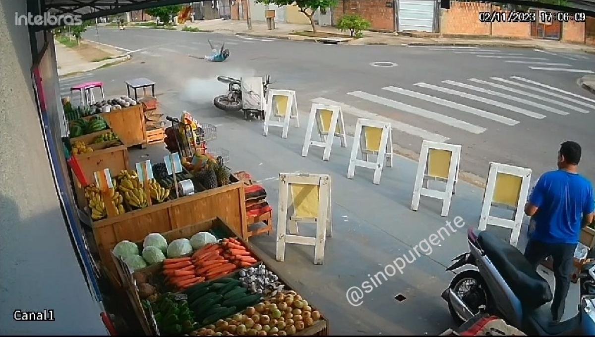 Imagem mostra o exato momento em que o motociclista atropela e mata uma criança de 7 anos, na tarde de quinta-feira (2), em Sinop. O condutor de 18 anos, que não é habilitado, estava em alta velocidade e embriagado.