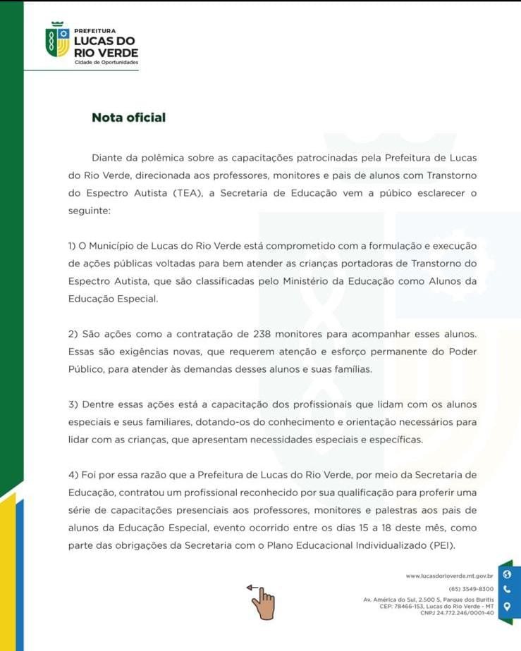 Diante da polêmcia sobre as capacitções patrocinadas pela Prefeitura de Lucas do Rio Verde, direcionadas ao professores, monitores e pais de alunos com Transtorno do Espectro Autista (TEA), a Secretaria Municipal de Educação vem a público esclarecer o seguinte: