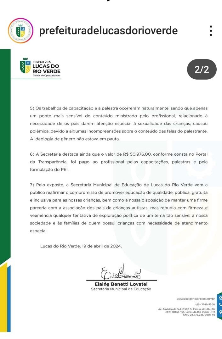 7) Pelo exposto, a Secretaria Municipal de Educação de Lucas do Rio Verde vem a público reafirmar o compromisso de promover educação de qualidade pública e gratuíta e inclusiva para todas as crianças, bem como a nossa disposição de manter uma firme parceria com a Associação dos Pais de Crianças Autistas, mas repudia com firmeza e veemência qualquer tentativa da exploração política de um tema tão sensivel à nossa sociedade e às famílias de quem possui crianças com necessidade de atendimento especial.