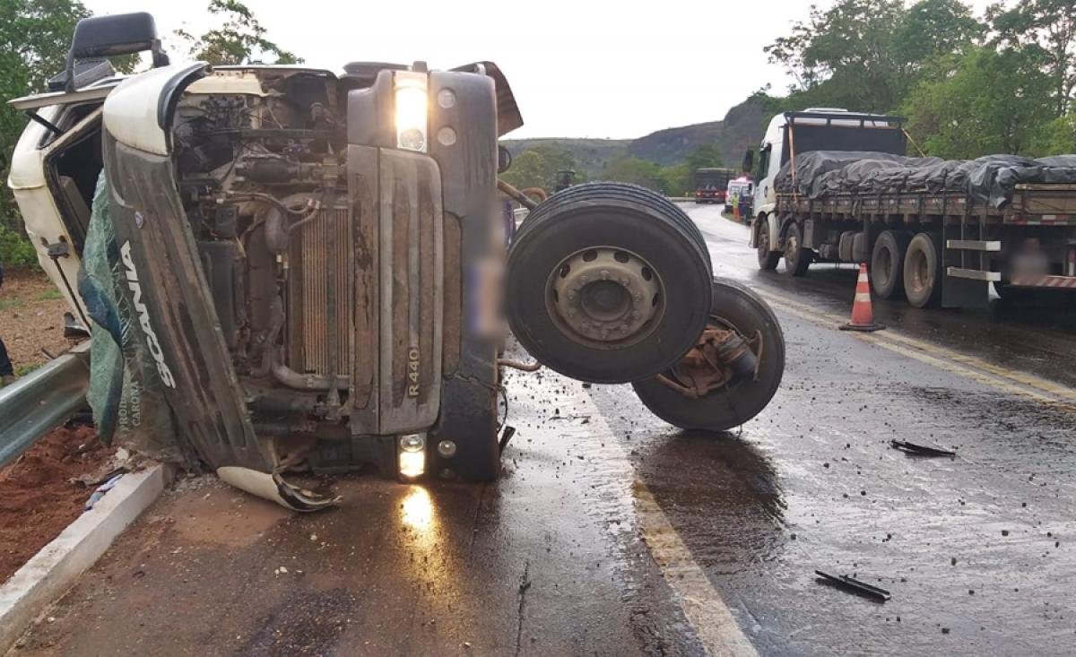 Conforme informações da polícia, um motorista, 29, perdeu o controle da carreta carregada com pedrisco e acabou tombando na pista. Marcio estava como passageiro no veículo de carga.