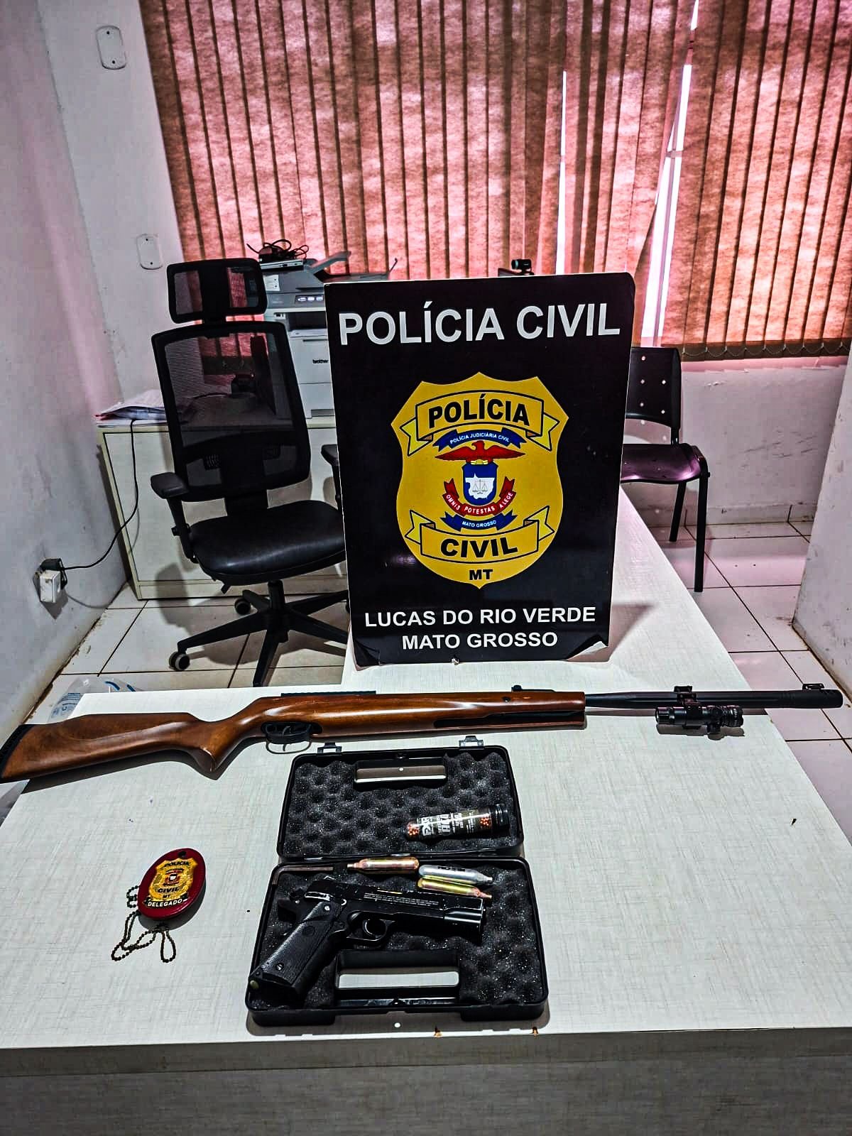 A partir dessas informações, os policiais se deslocaram até a residência do suspeito, onde localizaram diversas armas de airsoft que haviam sido roubadas no município cerca de duas semanas antes.