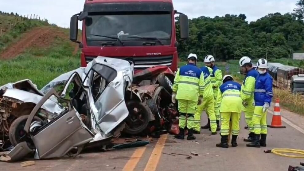 Os dois carros ficaram prensados entre as carretas e um dos veículos de carga bateu em uma caminhonete.
