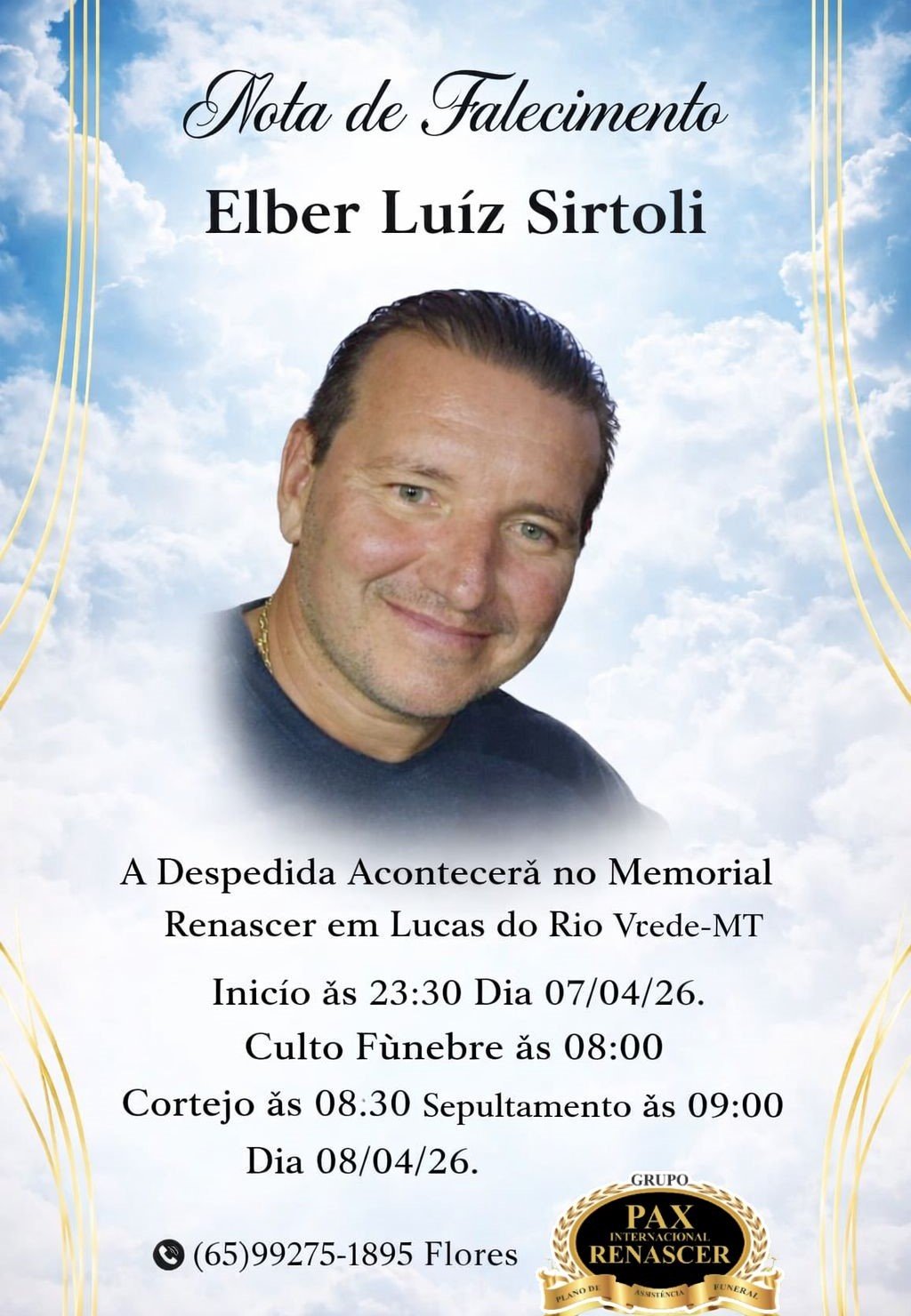 O velório de Elber Luiz Sirtoli, 44 anos, começará a partir das 23:30 hs desta terça-feira (7), no Espaço Pax Renascer, na Rua Giruá n. 1597, no Bairro Cidade Nova em Lucas do Rio Verde. O Sepultamento está programado para às 09 hs da manhã desta quarta-feira (8), no cemitério Jardim da Paz.